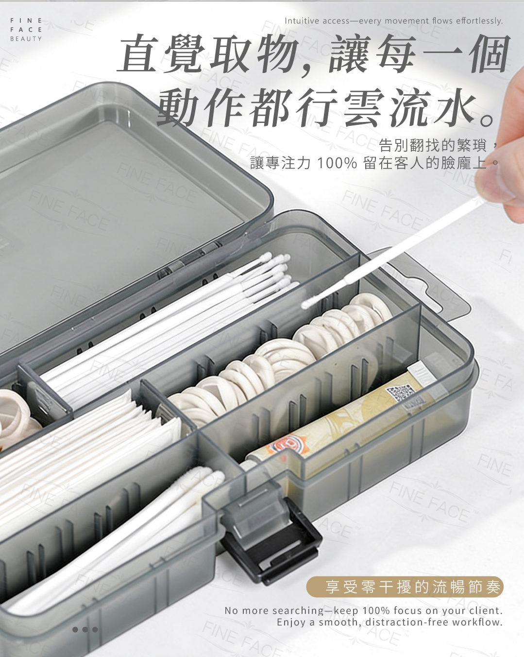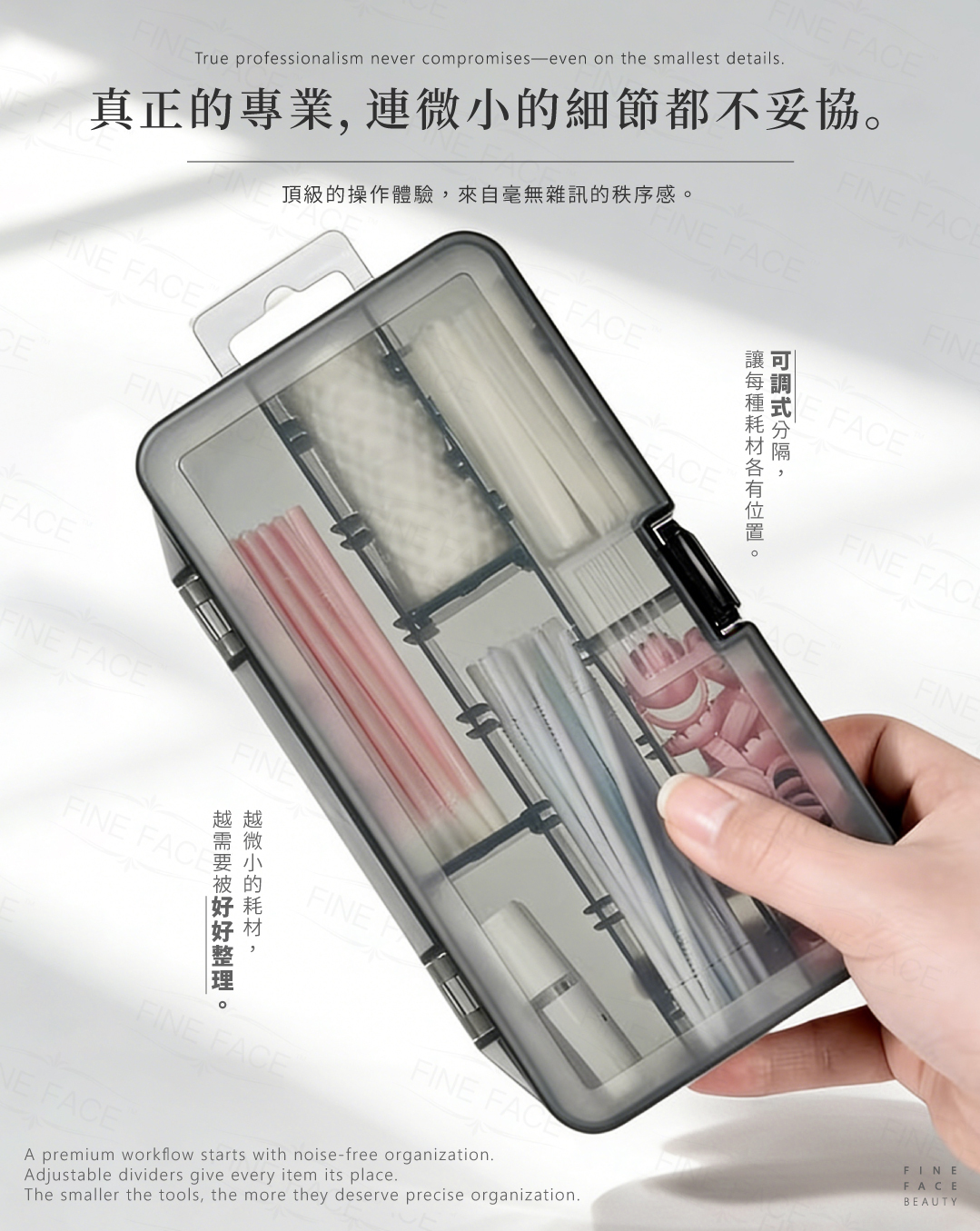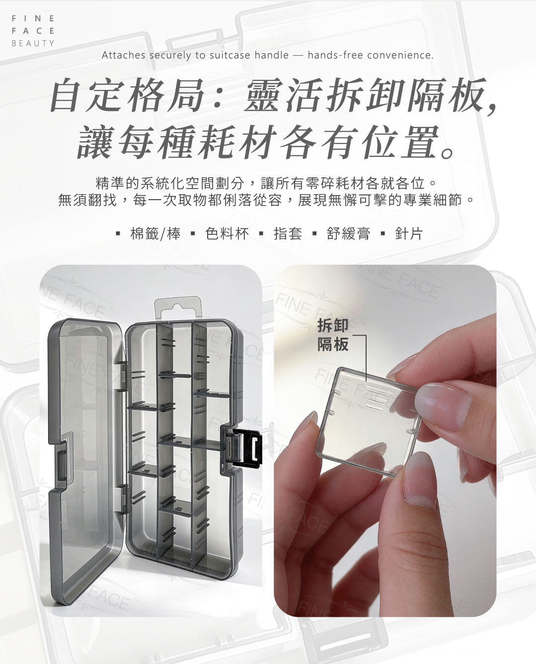 ☑ 靈活拆卸隔板,精準安放微棉籤與色料杯。