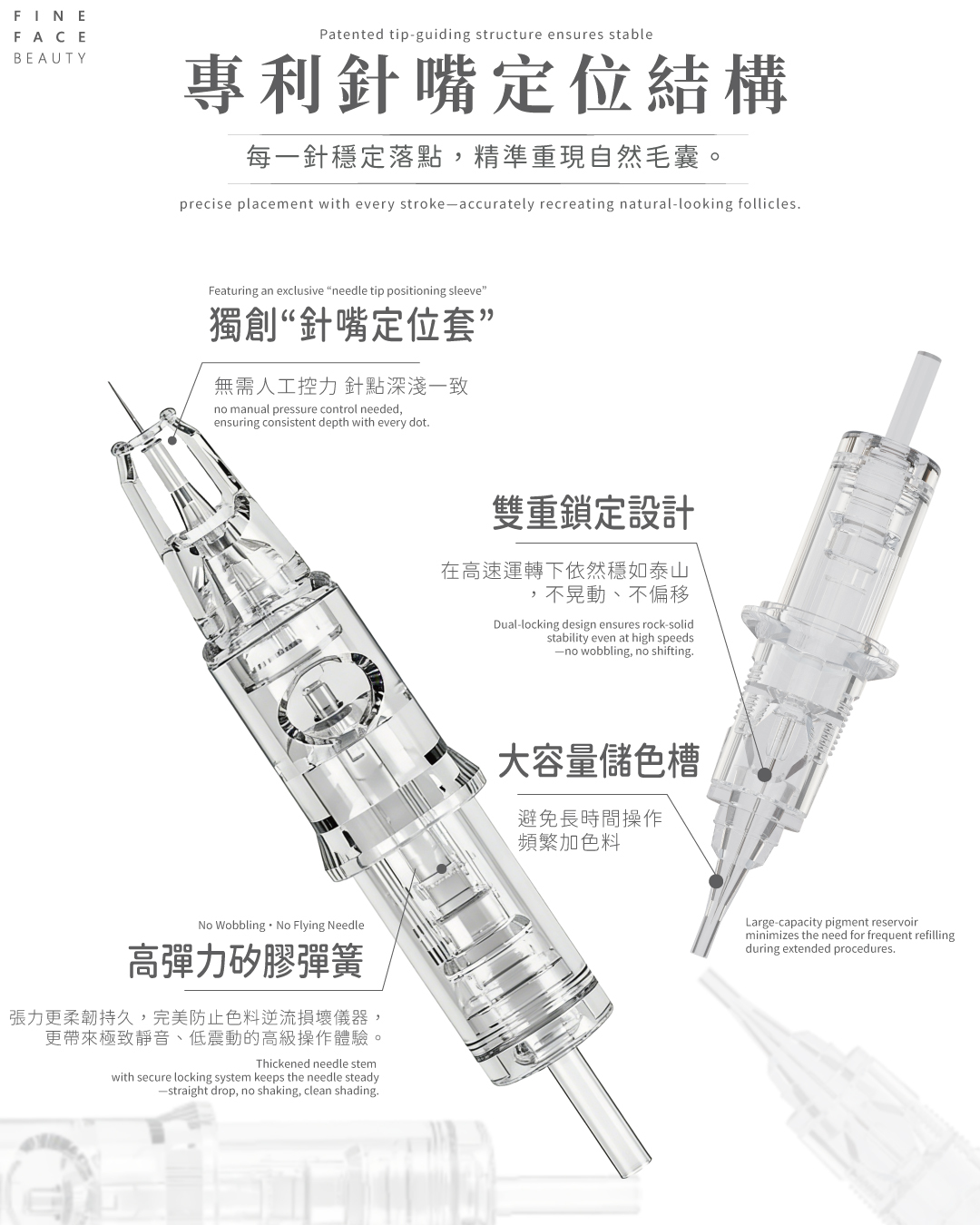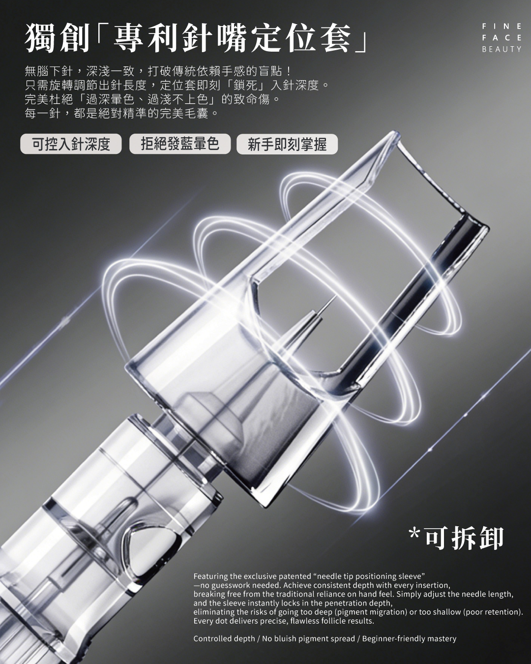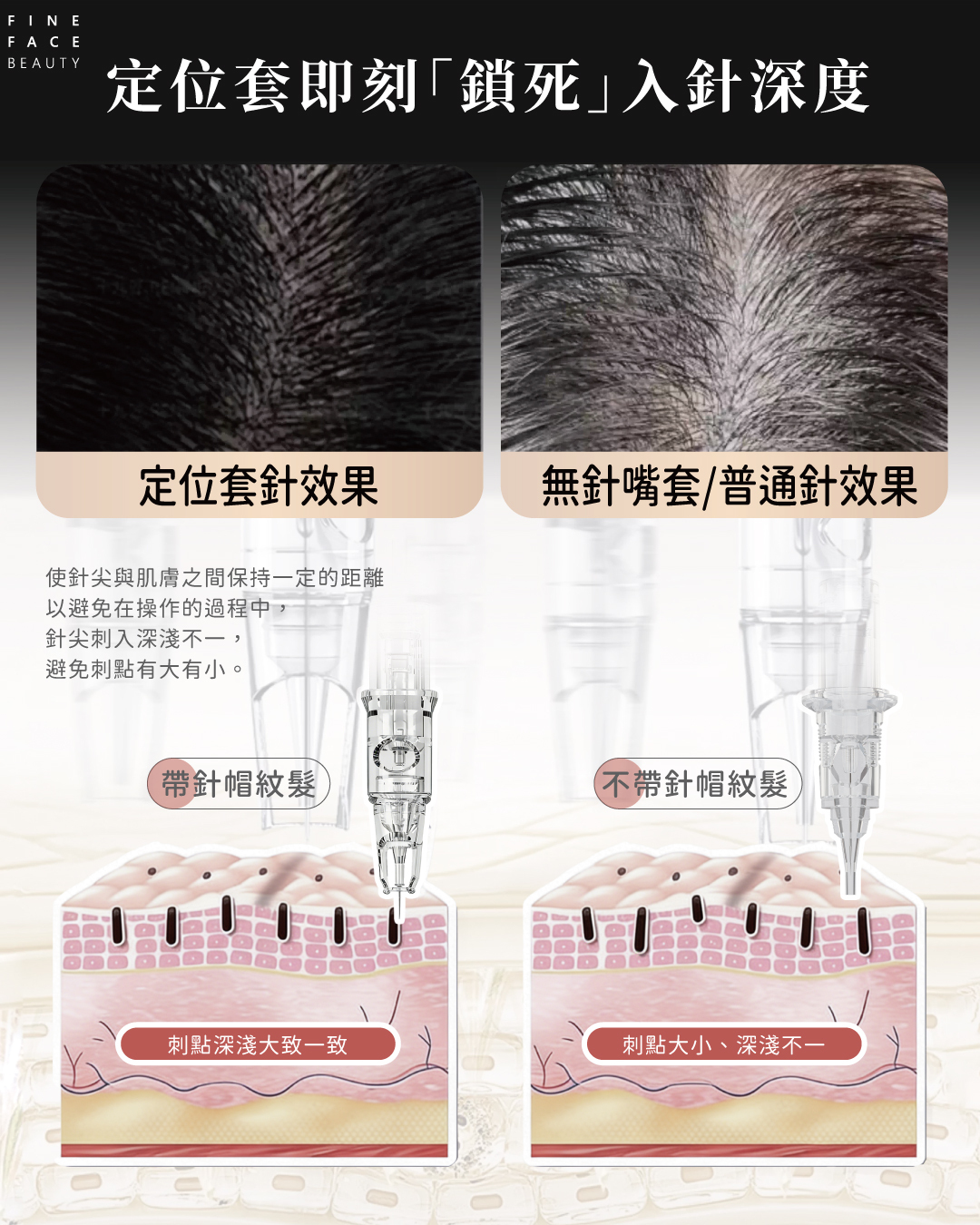 ● 專利針嘴定位套設計,自動控深,避免浮針與過深入針,不傷毛囊。