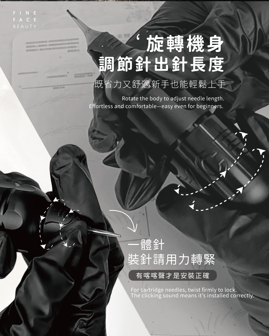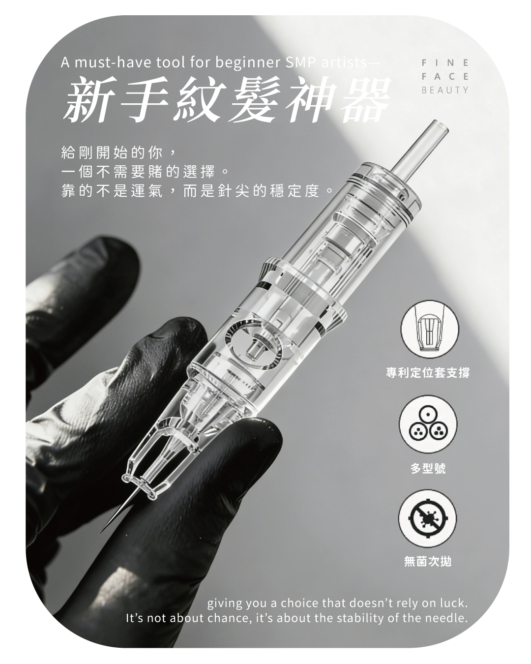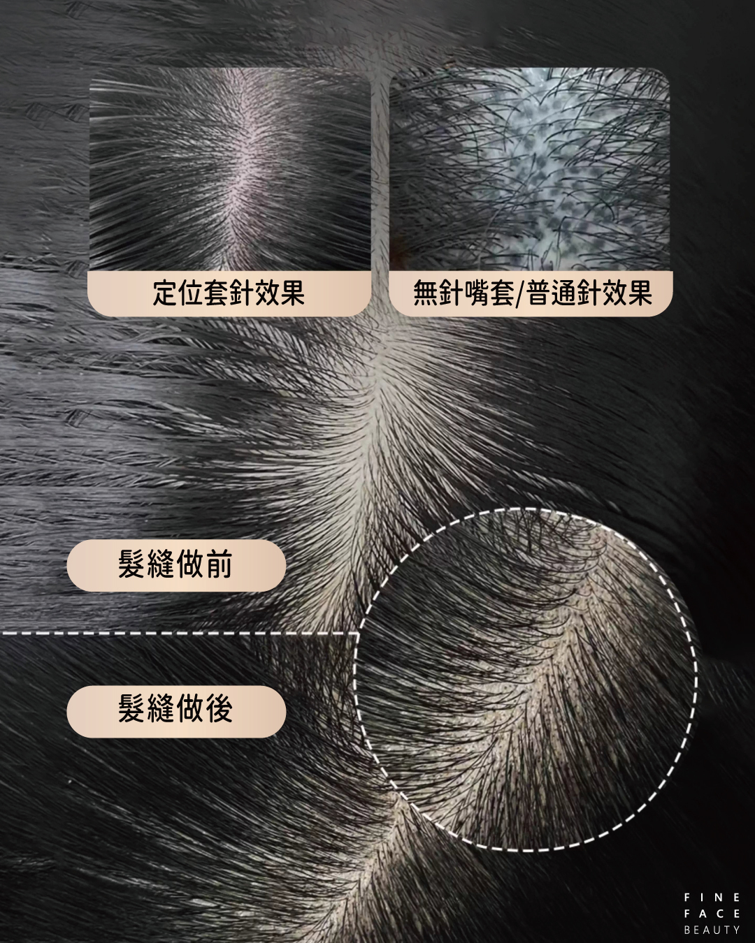 ● 專利針嘴定位套設計,自動控深,避免浮針與過深入針,不傷毛囊。