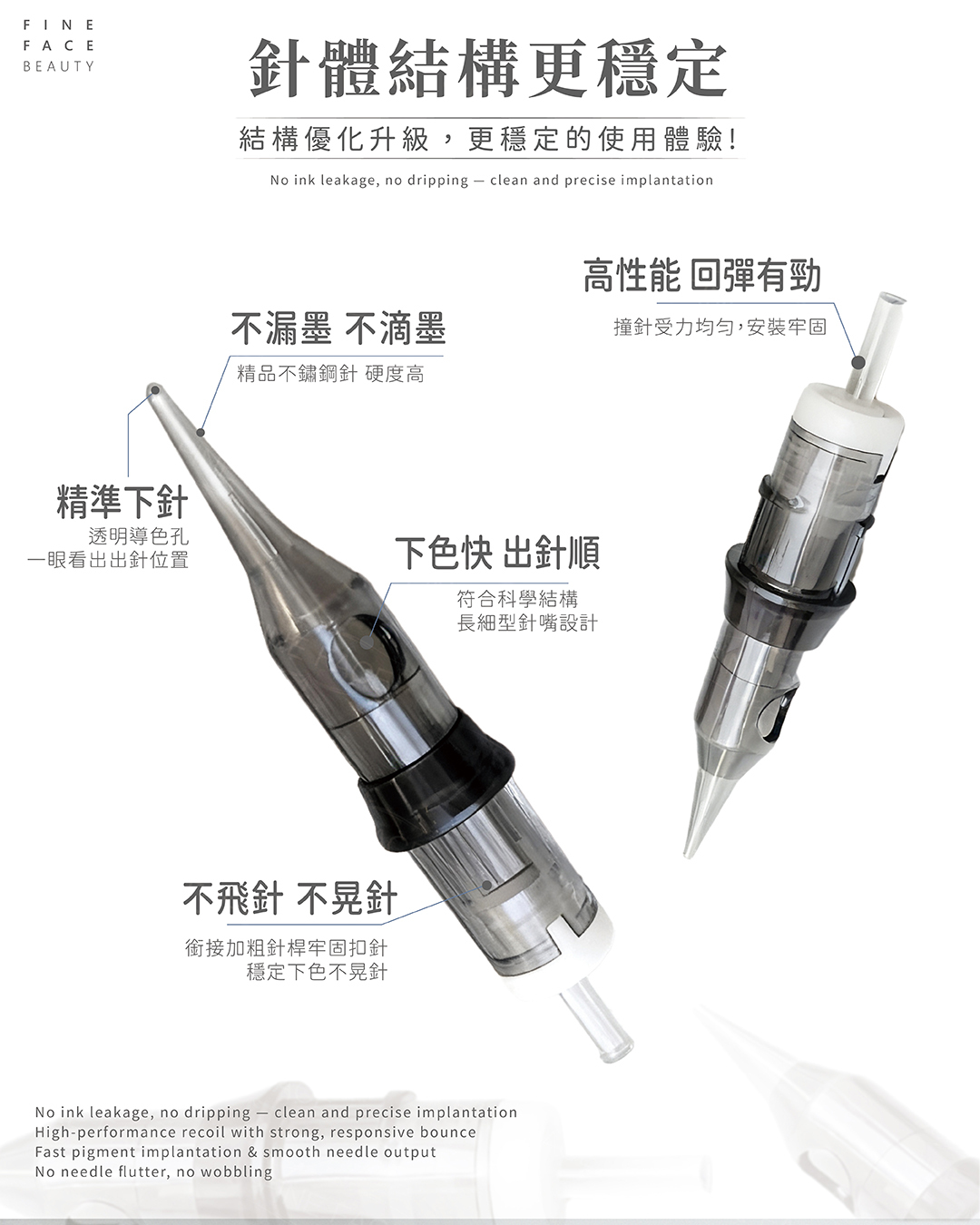 以 高剛性鋼針、科學針體結構、穩定出針系統 打造,